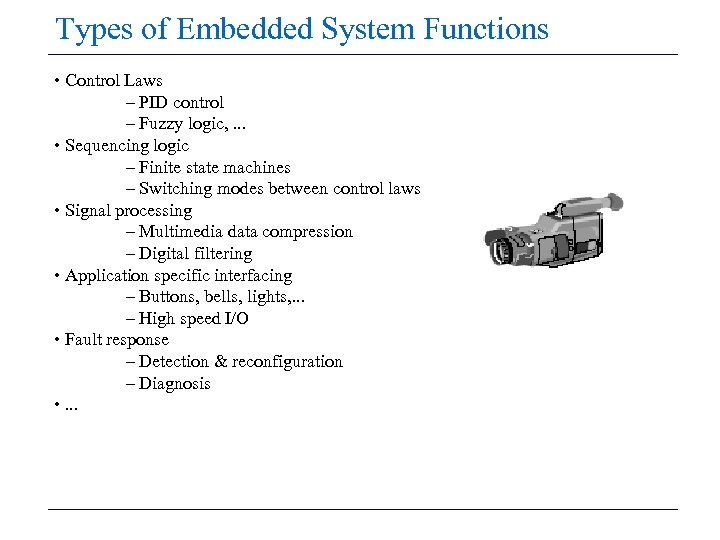 Types of Embedded System Functions • Control Laws – PID control – Fuzzy logic, . . . • Sequencing logic – Finite state machines – Switching modes between control laws • Signal processing – Multimedia data compression – Digital filtering • Application specific interfacing – Buttons, bells, lights, . . . – High speed I/O • Fault response – Detection & reconfiguration – Diagnosis • . . .