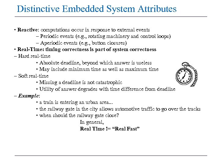 Distinctive Embedded System Attributes • Reactive: computations occur in response to external events – Periodic events (e. g. , rotating machinery and control loops) – Aperiodic events (e. g. , button closures) • Real-Time: timing correctness is part of system correctness – Hard real-time • Absolute deadline, beyond which answer is useless • May include minimum time as well as maximum time – Soft real-time • Missing a deadline is not catastrophic • Utility of answer degrades with time difference from deadline – Example: • a train is entering an urban area. . . • the railway gate in the city allows automotive traffic to go over the tracks • when should the railway gate close? In general, Real Time != “Real Fast”