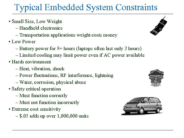 Typical Embedded System Constraints • Small Size, Low Weight – Handheld electronics – Transportation applications weight costs money • Low Power – Battery power for 8+ hours (laptops often last only 2 hours) – Limited cooling may limit power even if AC power available • Harsh environment – Heat, vibration, shock – Power fluctuations, RF interference, lightning – Water, corrosion, physical abuse • Safety critical operation – Must function correctly – Must not function incorrectly • Extreme cost sensitivity – $. 05 adds up over 1, 000 units