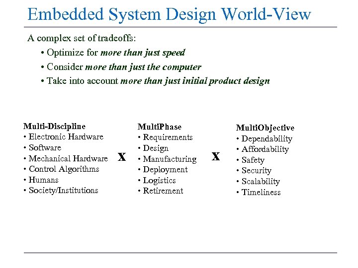 Embedded System Design World-View A complex set of tradeoffs: • Optimize for more than just speed • Consider more than just the computer • Take into account more than just initial product design Multi-Discipline • Electronic Hardware • Software • Mechanical Hardware • Control Algorithms • Humans • Society/Institutions x Multi. Phase • Requirements • Design • Manufacturing • Deployment • Logistics • Retirement x Multi. Objective • Dependability • Affordability • Safety • Security • Scalability • Timeliness