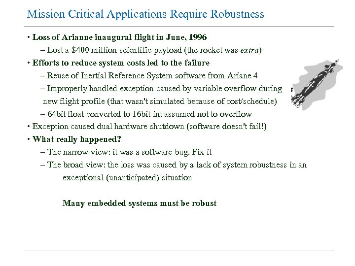 Mission Critical Applications Require Robustness • Loss of Arianne inaugural flight in June, 1996 – Lost a $400 million scientific payload (the rocket was extra) • Efforts to reduce system costs led to the failure – Reuse of Inertial Reference System software from Ariane 4 – Improperly handled exception caused by variable overflow during new flight profile (that wasn't simulated because of cost/schedule) – 64 bit float converted to 16 bit int assumed not to overflow • Exception caused dual hardware shutdown (software doesn't fail!) • What really happened? – The narrow view: it was a software bug. Fix it – The broad view: the loss was caused by a lack of system robustness in an exceptional (unanticipated) situation Many embedded systems must be robust