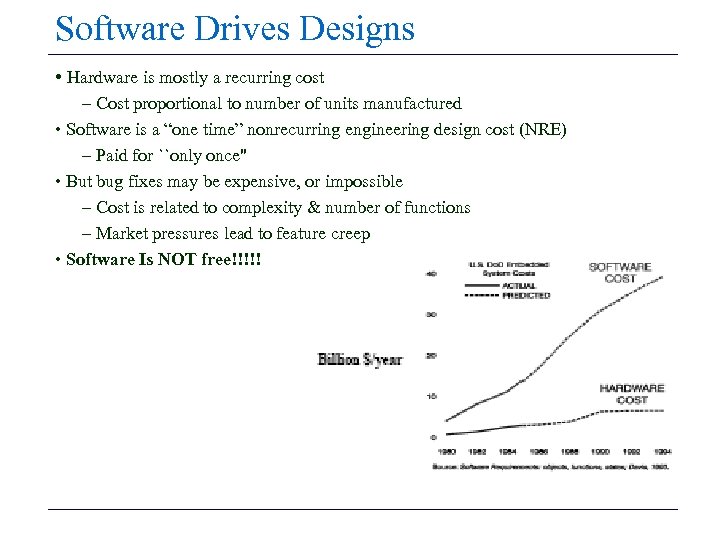 Software Drives Designs • Hardware is mostly a recurring cost – Cost proportional to number of units manufactured • Software is a “one time” nonrecurring engineering design cost (NRE) – Paid for ``only once'' • But bug fixes may be expensive, or impossible – Cost is related to complexity & number of functions – Market pressures lead to feature creep • Software Is NOT free!!!!!
