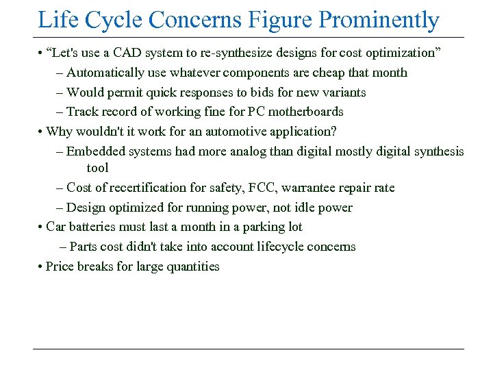 Life Cycle Concerns Figure Prominently • “Let's use a CAD system to re-synthesize designs for cost optimization” – Automatically use whatever components are cheap that month – Would permit quick responses to bids for new variants – Track record of working fine for PC motherboards • Why wouldn't it work for an automotive application? – Embedded systems had more analog than digital mostly digital synthesis tool – Cost of recertification for safety, FCC, warrantee repair rate – Design optimized for running power, not idle power • Car batteries must last a month in a parking lot – Parts cost didn't take into account lifecycle concerns • Price breaks for large quantities