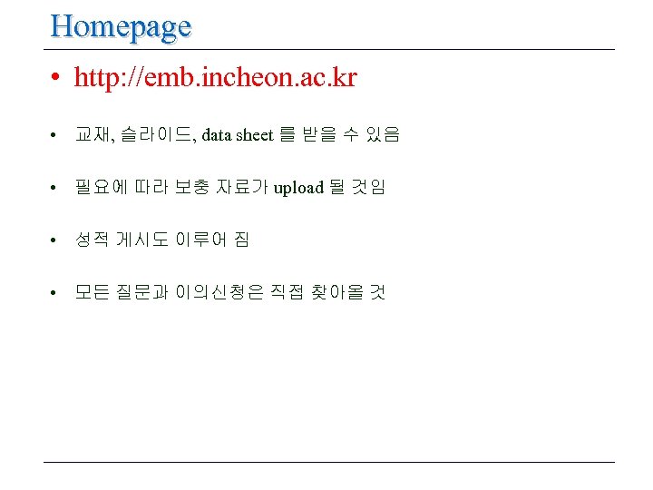 Homepage • http: //emb. incheon. ac. kr • 교재, 슬라이드, data sheet 를 받을 수 있음 • 필요에 따라 보충 자료가 upload 될 것임 • 성적 게시도 이루어 짐 • 모든 질문과 이의신청은 직접 찾아올 것