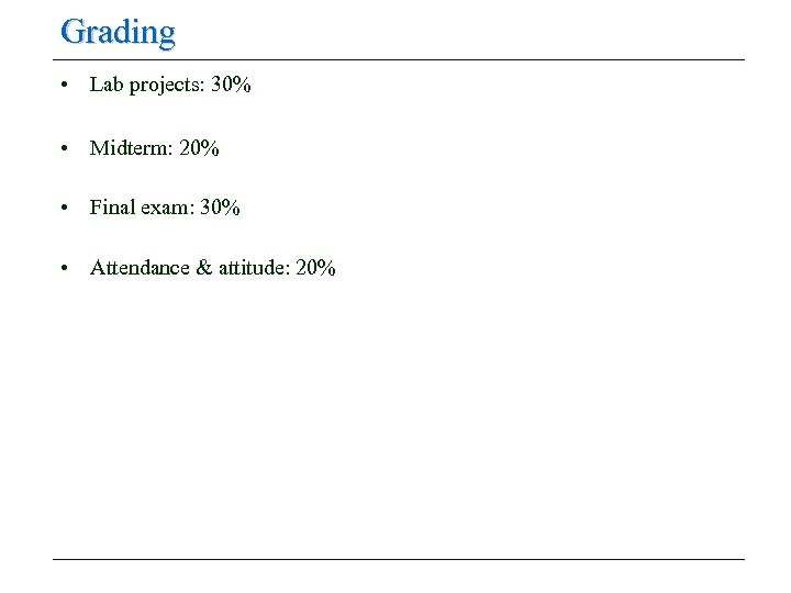 Grading • Lab projects: 30% • Midterm: 20% • Final exam: 30% • Attendance & attitude: 20%