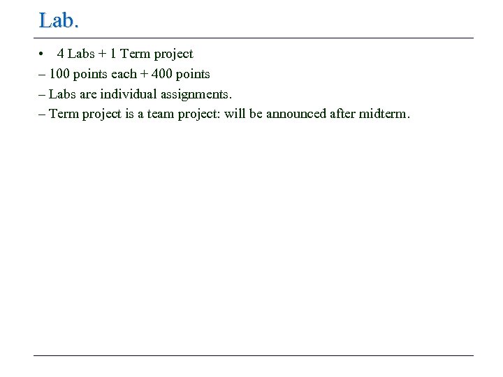 Lab. • 4 Labs + 1 Term project – 100 points each + 400 points – Labs are individual assignments. – Term project is a team project: will be announced after midterm.