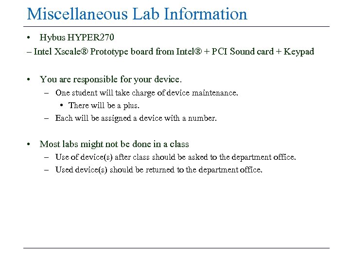 Miscellaneous Lab Information • Hybus HYPER 270 – Intel Xscale® Prototype board from Intel® + PCI Sound card + Keypad • You are responsible for your device. – One student will take charge of device maintenance. • There will be a plus. – Each will be assigned a device with a number. • Most labs might not be done in a class – Use of device(s) after class should be asked to the department office. – Used device(s) should be returned to the department office.