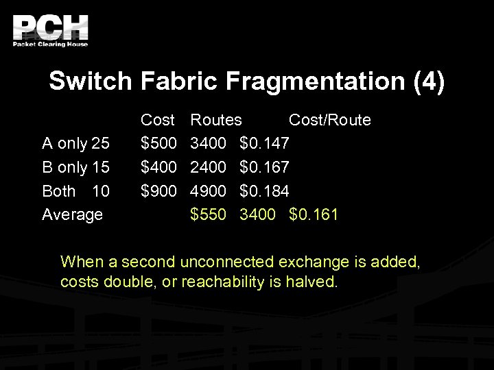 Switch Fabric Fragmentation (4) A only 25 B only 15 Both 10 Average Cost $500 $400 $900 Routes Cost/Route 3400 $0. 147 2400 $0. 167 4900 $0. 184 $550 3400 $0. 161 When a second unconnected exchange is added, costs double, or reachability is halved.