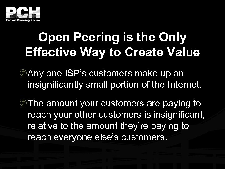 Open Peering is the Only Effective Way to Create Value Any one ISP’s customers make up an insignificantly small portion of the Internet. The amount your customers are paying to reach your other customers is insignificant, relative to the amount they’re paying to reach everyone else’s customers.