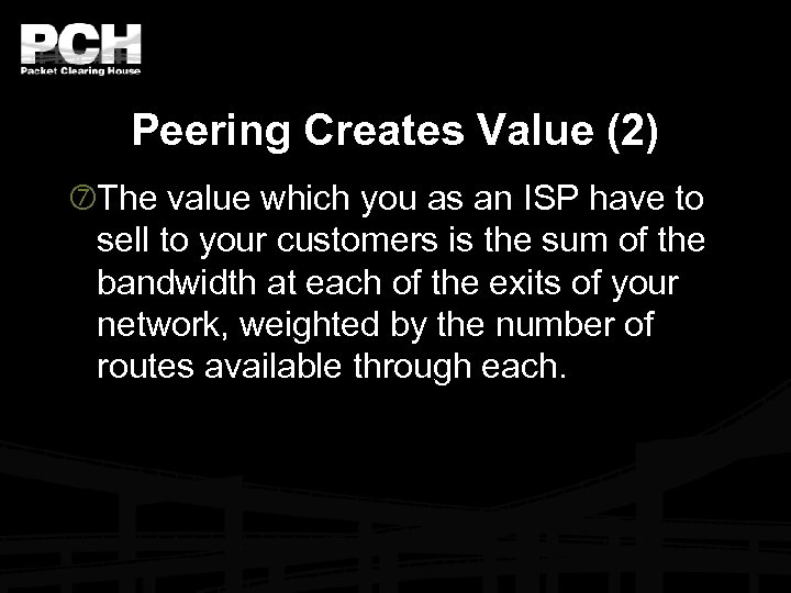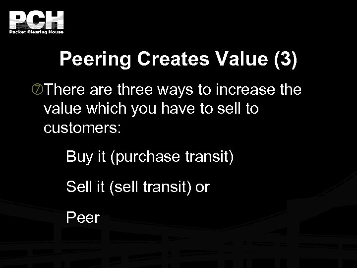 Peering Creates Value (3) There are three ways to increase the value which you have to sell to customers: Buy it (purchase transit) Sell it (sell transit) or Peer
