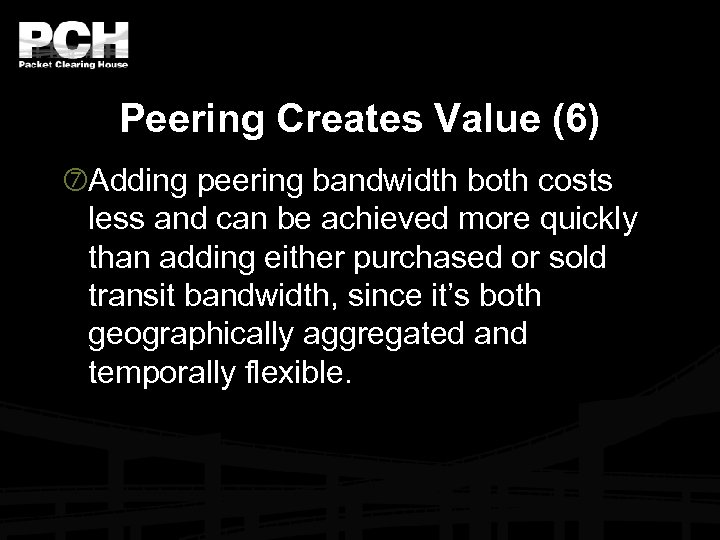 Peering Creates Value (6) Adding peering bandwidth both costs less and can be achieved more quickly than adding either purchased or sold transit bandwidth, since it’s both geographically aggregated and temporally flexible.