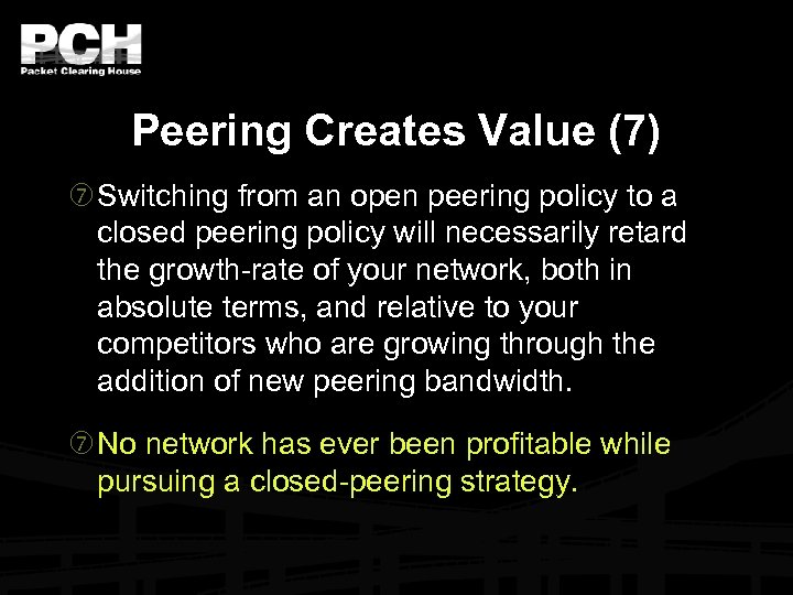 Peering Creates Value (7) Switching from an open peering policy to a closed peering policy will necessarily retard the growth-rate of your network, both in absolute terms, and relative to your competitors who are growing through the addition of new peering bandwidth. No network has ever been profitable while pursuing a closed-peering strategy.