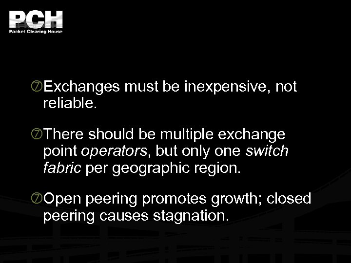 Exchanges must be inexpensive, not reliable. There should be multiple exchange point operators, but only one switch fabric per geographic region. Open peering promotes growth; closed peering causes stagnation.