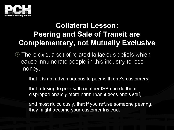 Collateral Lesson: Peering and Sale of Transit are Complementary, not Mutually Exclusive There exist a set of related fallacious beliefs which cause innumerate people in this industry to lose money: that it is not advantageous to peer with one’s customers, that refusing to peer with another ISP can do them disproportionately more harm than it does one’s self, and most ridiculously, that if you refuse someone peering, they might become your customer instead.