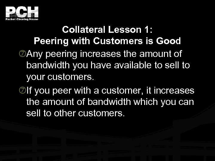 Collateral Lesson 1: Peering with Customers is Good Any peering increases the amount of bandwidth you have available to sell to your customers. If you peer with a customer, it increases the amount of bandwidth which you can sell to other customers.