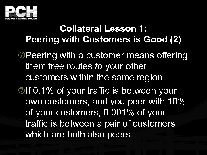 Collateral Lesson 1: Peering with Customers is Good (2) Peering with a customer means offering them free routes to your other customers within the same region. If 0. 1% of your traffic is between your own customers, and you peer with 10% of your customers, 0. 001% of your traffic is between a pair of customers which are both also peers.