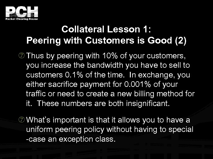Collateral Lesson 1: Peering with Customers is Good (2) Thus by peering with 10% of your customers, you increase the bandwidth you have to sell to customers 0. 1% of the time. In exchange, you either sacrifice payment for 0. 001% of your traffic or need to create a new billing method for it. These numbers are both insignificant. What’s important is that it allows you to have a uniform peering policy without having to special -case an exception class.