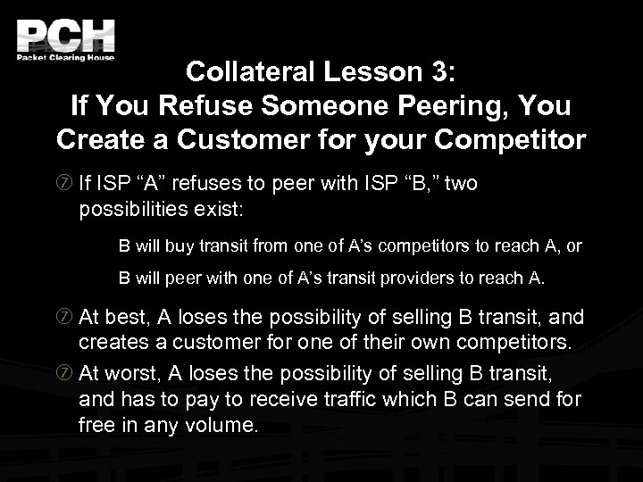 Collateral Lesson 3: If You Refuse Someone Peering, You Create a Customer for your Competitor If ISP “A” refuses to peer with ISP “B, ” two possibilities exist: B will buy transit from one of A’s competitors to reach A, or B will peer with one of A’s transit providers to reach A. At best, A loses the possibility of selling B transit, and creates a customer for one of their own competitors. At worst, A loses the possibility of selling B transit, and has to pay to receive traffic which B can send for free in any volume.