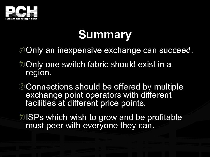 Summary Only an inexpensive exchange can succeed. Only one switch fabric should exist in a region. Connections should be offered by multiple exchange point operators with different facilities at different price points. ISPs which wish to grow and be profitable must peer with everyone they can.