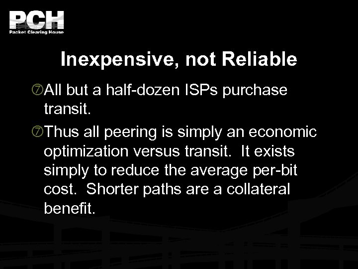 Inexpensive, not Reliable All but a half-dozen ISPs purchase transit. Thus all peering is simply an economic optimization versus transit. It exists simply to reduce the average per-bit cost. Shorter paths are a collateral benefit.