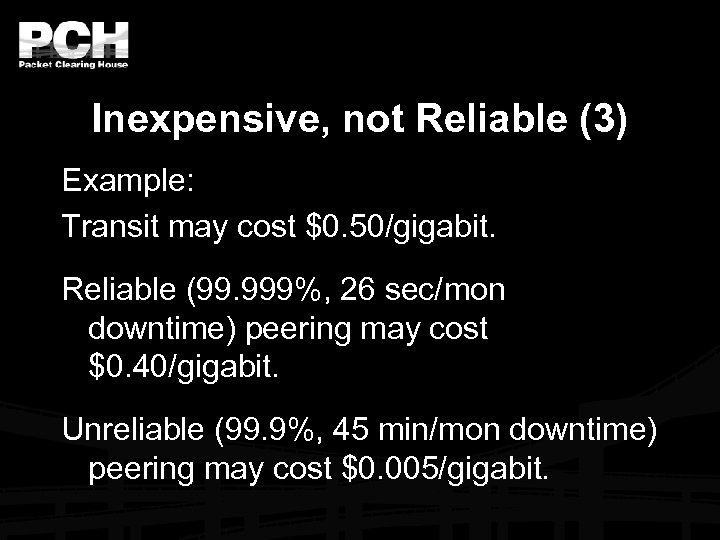 Inexpensive, not Reliable (3) Example: Transit may cost $0. 50/gigabit. Reliable (99. 999%, 26 sec/mon downtime) peering may cost $0. 40/gigabit. Unreliable (99. 9%, 45 min/mon downtime) peering may cost $0. 005/gigabit.