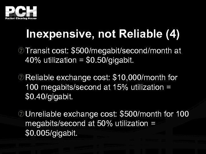 Inexpensive, not Reliable (4) Transit cost: $500/megabit/second/month at 40% utilization = $0. 50/gigabit. Reliable exchange cost: $10, 000/month for 100 megabits/second at 15% utilization = $0. 40/gigabit. Unreliable exchange cost: $500/month for 100 megabits/second at 50% utilization = $0. 005/gigabit.