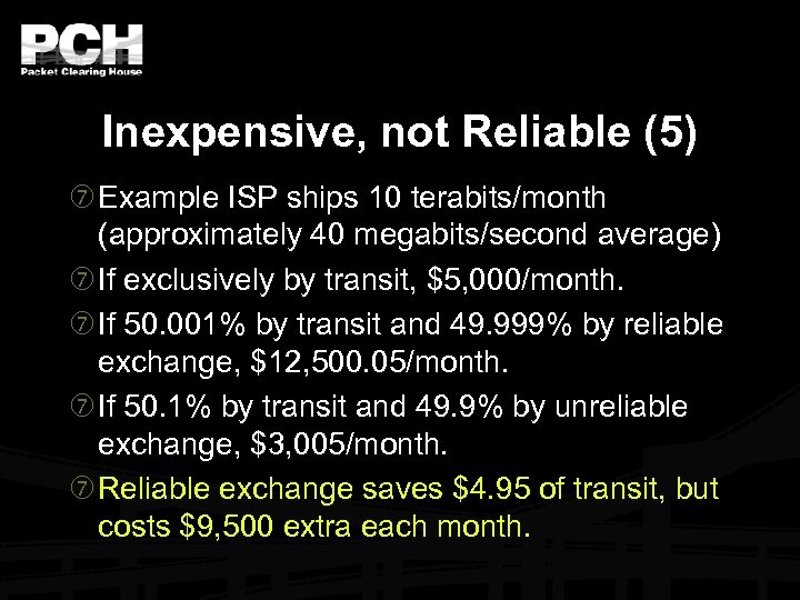 Inexpensive, not Reliable (5) Example ISP ships 10 terabits/month (approximately 40 megabits/second average) If exclusively by transit, $5, 000/month. If 50. 001% by transit and 49. 999% by reliable exchange, $12, 500. 05/month. If 50. 1% by transit and 49. 9% by unreliable exchange, $3, 005/month. Reliable exchange saves $4. 95 of transit, but costs $9, 500 extra each month.
