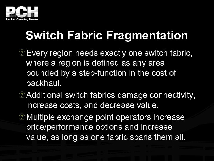 Switch Fabric Fragmentation Every region needs exactly one switch fabric, where a region is defined as any area bounded by a step-function in the cost of backhaul. Additional switch fabrics damage connectivity, increase costs, and decrease value. Multiple exchange point operators increase price/performance options and increase value, as long as one fabric spans them all.