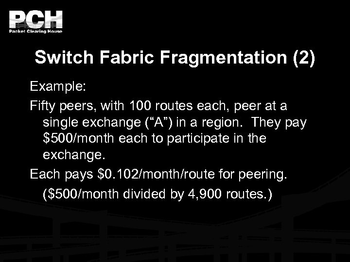 Switch Fabric Fragmentation (2) Example: Fifty peers, with 100 routes each, peer at a single exchange (“A”) in a region. They pay $500/month each to participate in the exchange. Each pays $0. 102/month/route for peering. ($500/month divided by 4, 900 routes. )