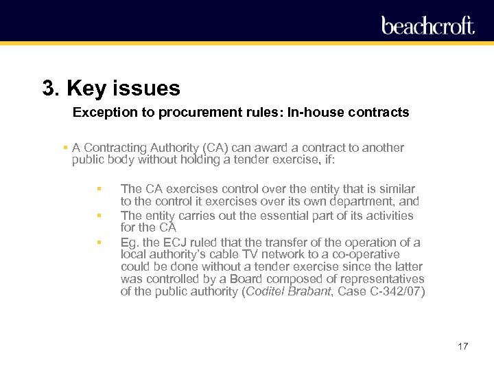 3. Key issues Exception to procurement rules: In-house contracts § A Contracting Authority (CA) can award a contract to another public body without holding a tender exercise, if: § § § The CA exercises control over the entity that is similar to the control it exercises over its own department, and The entity carries out the essential part of its activities for the CA Eg. the ECJ ruled that the transfer of the operation of a local authority’s cable TV network to a co-operative could be done without a tender exercise since the latter was controlled by a Board composed of representatives of the public authority (Coditel Brabant, Case C-342/07) 17