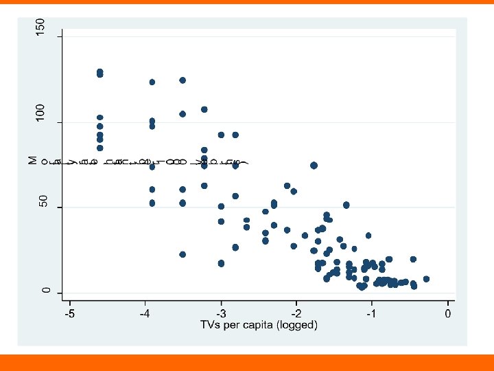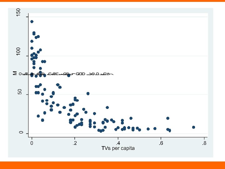 TVs and Infant Mortality • TVs as proxy for resources or wealth • Biggest differences at the low end? – E. g. , “there a couple of TVs in town” and “some people have TVs in their private homes”