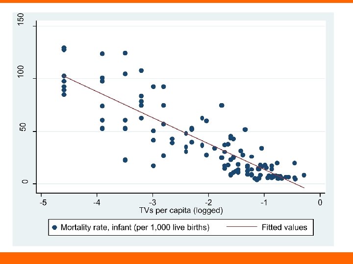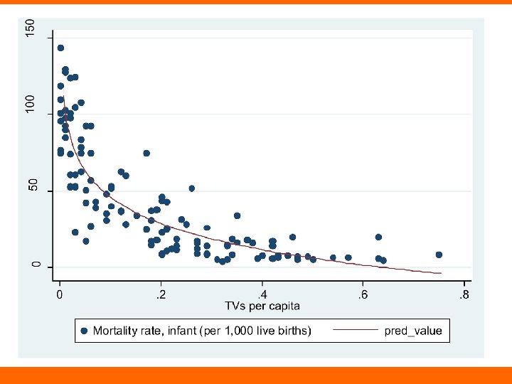 TVs and Infant Mortality • Squared term or logarithm? Coef. SE T P TVs per capita -380. 088 29. 949 -12. 690 0. 000 TVs per capita (squared) 410. 957 51. 629 7. 960 0. 000 Constant 90. 197 3. 353 26. 900 0. 000