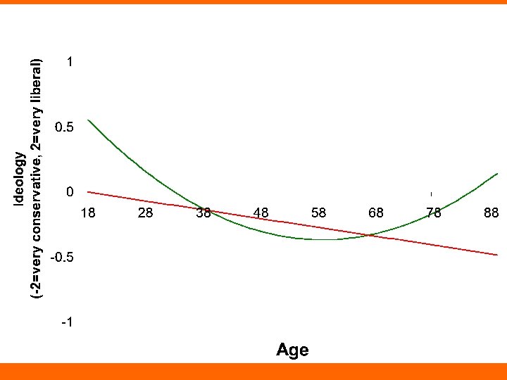 Age and Political Ideology Coef. SE T P Age -0. 007 0. 004 -1. 740 0. 082 Constant 0. 122 0. 209 0. 580 0. 561 What would we conclude from this analysis? Coef. SE T P Age -0. 065 0. 025 -2. 630 0. 009 Age-squared 0. 001 0. 000 2. 390 0. 017 Constant 1. 554 0. 635 2. 450 0. 015