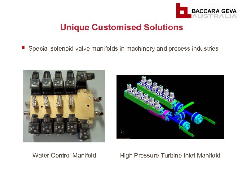 Unique Customised Solutions § Special solenoid valve manifolds in machinery and process industries Water Control Manifold High Pressure Turbine Inlet Manifold