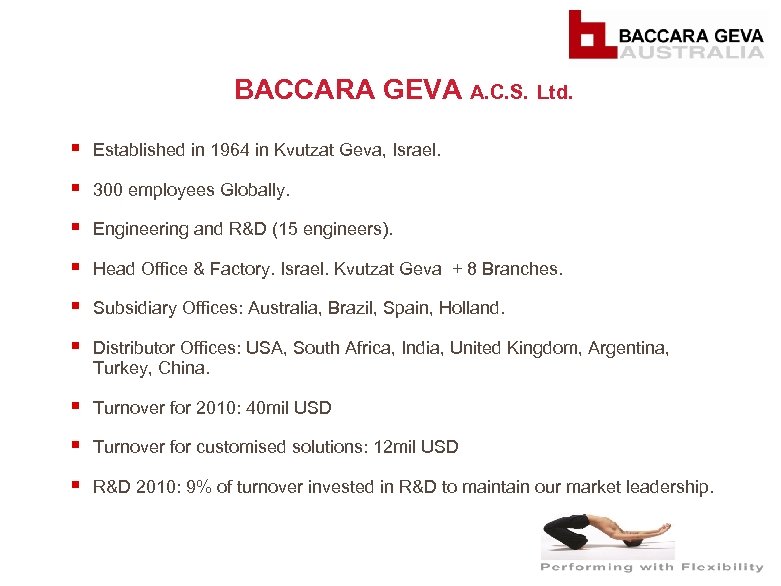 BACCARA GEVA A. C. S. Ltd. § Established in 1964 in Kvutzat Geva, Israel. § 300 employees Globally. § Engineering and R&D (15 engineers). § Head Office & Factory. Israel. Kvutzat Geva + 8 Branches. § Subsidiary Offices: Australia, Brazil, Spain, Holland. § Distributor Offices: USA, South Africa, India, United Kingdom, Argentina, Turkey, China. § Turnover for 2010: 40 mil USD § Turnover for customised solutions: 12 mil USD § R&D 2010: 9% of turnover invested in R&D to maintain our market leadership.