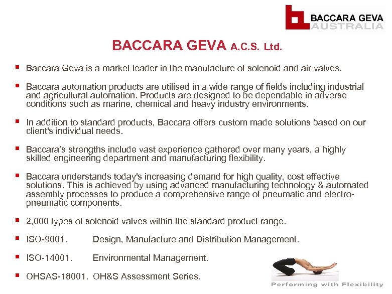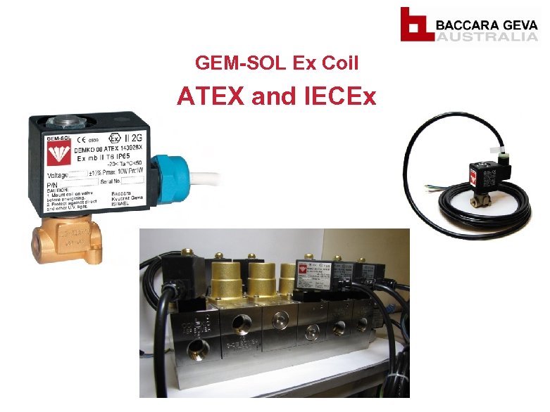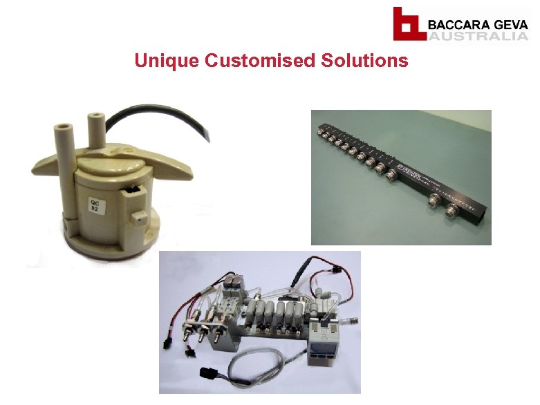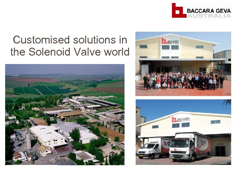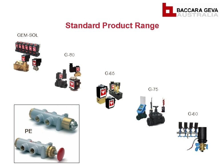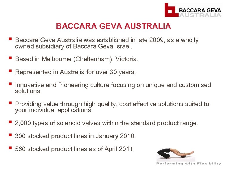 BACCARA GEVA AUSTRALIA § Baccara Geva Australia was established in late 2009, as a wholly owned subsidiary of Baccara Geva Israel. § Based in Melbourne (Cheltenham), Victoria. § Represented in Australia for over 30 years. § Innovative and Pioneering culture focusing on unique and customised solutions. § Providing value through high quality, cost effective solutions suited to your individual applications. § 2, 000 types of solenoid valves within the standard product range. § 300 stocked product lines in January 2010. § 560 stocked product lines as of April 2011.
