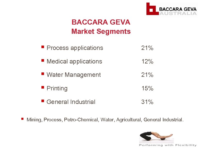 BACCARA GEVA Market Segments § Process applications § Medical applications 12% § Water Management 21% § Printing 15% § General Industrial § 21% 31% Mining, Process, Petro-Chemical, Water, Agricultural, General Industrial.