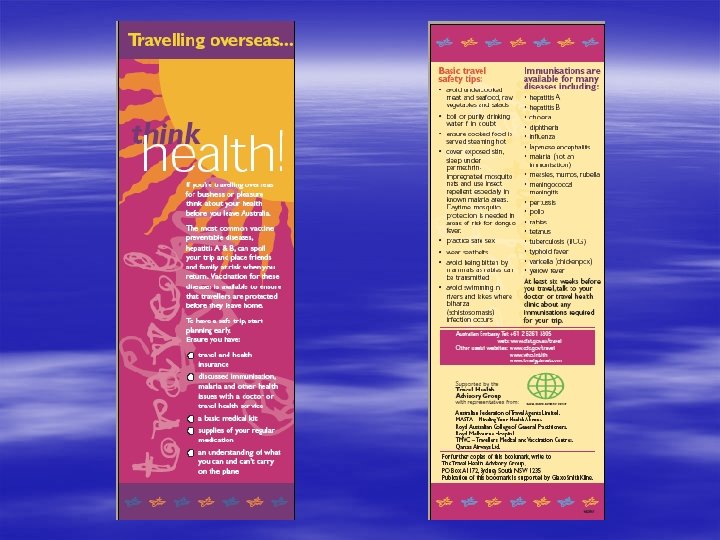 ADVISE AND DISCUSS § Insects § Ingestions repellents, nets, permethrin care with food and water diet/teeth (including airlines/jetlag/DVT)* § Indiscretions STI’s, HIV § Injuries accident avoidance, personal safety § Immersion schistosomiasis § Insurance* health and travel insurance* finding medical assistance o/s* (adapted* from NZPHR; 1996; 3(8): 57 -59)
