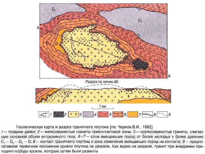 Определение относительного возраста интрузий. Интрузивное тело, прорывающее отложения карбона (С) и перекрытое отложениями мелового возраста (К). а, б – пересекающиеся дайки.
