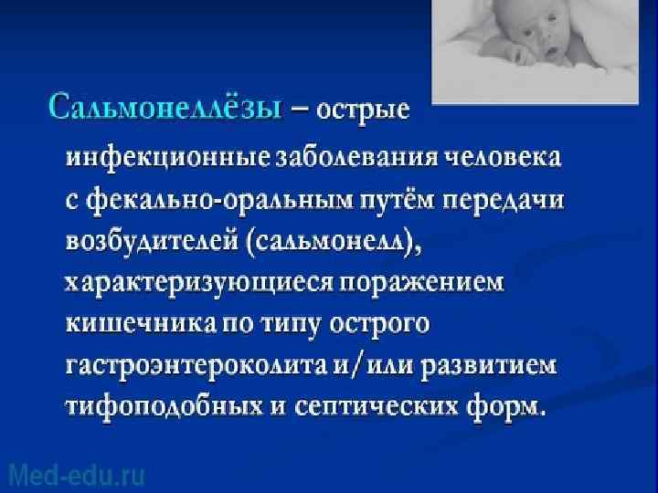 Сальмонеллез Сальмонеллы - грамм отрицательные бактерии, сохранияющиеся во внешней среде до 40 дней. Различают 7 подвидов, 2000 сероваров , наибольшее клиническое значение имеет S/ typhimurium Сальмонеллез – антропоноз. Источник инфекции: больной человек, бактерионоситель, животные, чаще водоплавающие птицы, индейки, куры. Контаминированные яйца птиц. Заражение может происходить через инфицированные мясные и молочные продукты, овощи. Описаны водные вспышки.