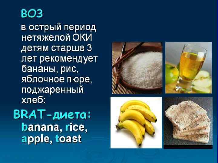 Лечение Лечебное питание детям первого года жизни проводится с ограничением как при секреторных диареях в соответствие со степенью тяжести болезни. Детям старше 1 года протертый стол « 4» с ограничением жира (овощи, яйца, каши, кисломолочные продукты). С 3 -4 дня –мясо, творог, печеные яблоки. С 5 -7 дня –обычный рацион с исключением цельного молока, ржаного хлеба, свеклы, чеснока, кислых ягод и фруктов до 2 -3 недель.