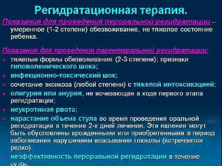 Критерии госпитализации ( ВОЗ ) 2008 2012 -Шок -При тяжелой степени дегидратации у ребенка -Тяжелая дегидратация(>9%массы тела -Неукротимая рвота у ребенка -Неврологические нарушения (летаргия, судороги и т. д. ) -Невозможность поддержания водного баланса ребенком по причине рвоты или диареи -Неудача пероральной регидратации Неукротимая или желчная рвота -Ухаживающие не могут обеспечить необходимого ухода на дому и/или существуют проблемы социального или логистического характера -Возможное хирургическое вмешательство -Ухаживающие не могут обеспечить необходимого ухода на дому и/или существуют проблемы социального или логистического характера