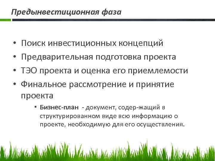 Предынвестиционная фаза • • Поиск инвестиционных концепций Предварительная подготовка проекта ТЭО проекта и оценка его приемлемости Финальное рассмотрение и принятие проекта • Бизнес-план - документ, содер жащий в структурированном виде всю информацию о проекте, необходимую для его осуществления.