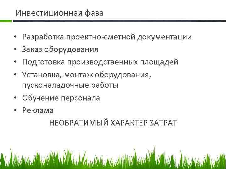 Инвестиционная фаза Разработка проектно сметной документации Заказ оборудования Подготовка производственных площадей Установка, монтаж оборудования, пусконаладочные работы • Обучение персонала • Реклама НЕОБРАТИМЫЙ ХАРАКТЕР ЗАТРАТ • •