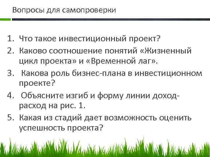 Вопросы для самопроверки 1. Что такое инвестиционный проект? 2. Каково соотношение понятий «Жизненный цикл проекта» и «Временной лаг» . 3. Какова роль бизнес плана в инвестиционном проекте? 4. Объясните изгиб и форму линии доход расход на рис. 1. 5. Какая из стадий дает возможность оценить успешность проекта?