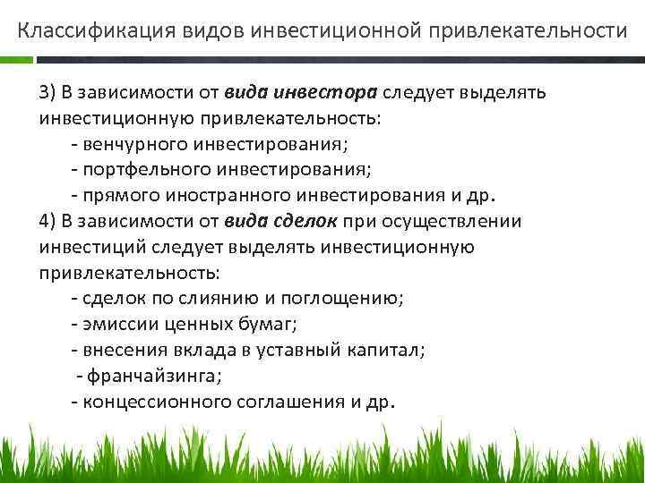 Классификация видов инвестиционной привлекательности 3) В зависимости от вида инвестора следует выделять инвестиционную привлекательность: венчурного инвестирования; портфельного инвестирования; прямого иностранного инвестирования и др. 4) В зависимости от вида сделок при осуществлении инвестиций следует выделять инвестиционную привлекательность: сделок по слиянию и поглощению; эмиссии ценных бумаг; внесения вклада в уставный капитал; франчайзинга; концессионного соглашения и др.
