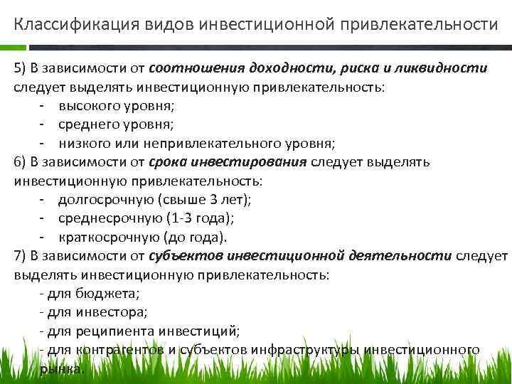 Классификация видов инвестиционной привлекательности 5) В зависимости от соотношения доходности, риска и ликвидности следует выделять инвестиционную привлекательность: высокого уровня; среднего уровня; низкого или непривлекательного уровня; 6) В зависимости от срока инвестирования следует выделять инвестиционную привлекательность: долгосрочную (свыше 3 лет); среднесрочную (1 3 года); краткосрочную (до года). 7) В зависимости от субъектов инвестиционной деятельности следует выделять инвестиционную привлекательность: для бюджета; для инвестора; для реципиента инвестиций; для контрагентов и субъектов инфраструктуры инвестиционного рынка.