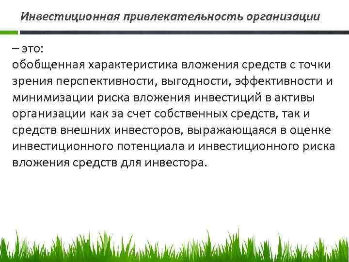 Инвестиционная привлекательность организации – это: обобщенная характеристика вложения средств с точки зрения перспективности, выгодности, эффективности и минимизации риска вложения инвестиций в активы организации как за счет собственных средств, так и средств внешних инвесторов, выражающаяся в оценке инвестиционного потенциала и инвестиционного риска вложения средств для инвестора.