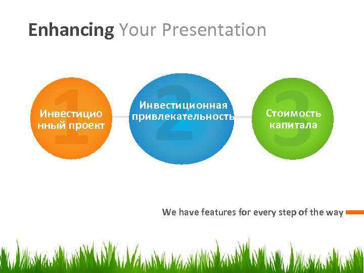 Enhancing Your Presentation 1 2 3 Инвестицио нный проект Инвестиционная привлекательность Стоимость капитала We have features for every step of the way