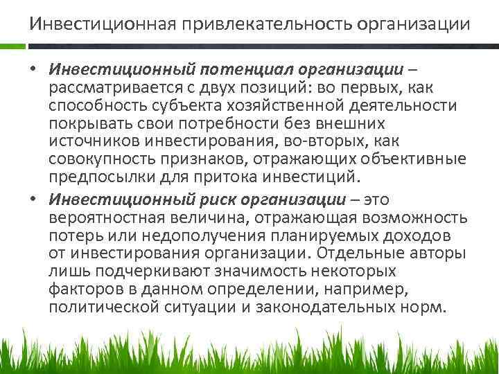 Инвестиционная привлекательность организации • Инвестиционный потенциал организации – рассматривается с двух позиций: во первых, как способность субъекта хозяйственной деятельности покрывать свои потребности без внешних источников инвестирования, во вторых, как совокупность признаков, отражающих объективные предпосылки для притока инвестиций. • Инвестиционный риск организации – это вероятностная величина, отражающая возможность потерь или недополучения планируемых доходов от инвестирования организации. Отдельные авторы лишь подчеркивают значимость некоторых факторов в данном определении, например, политической ситуации и законодательных норм.